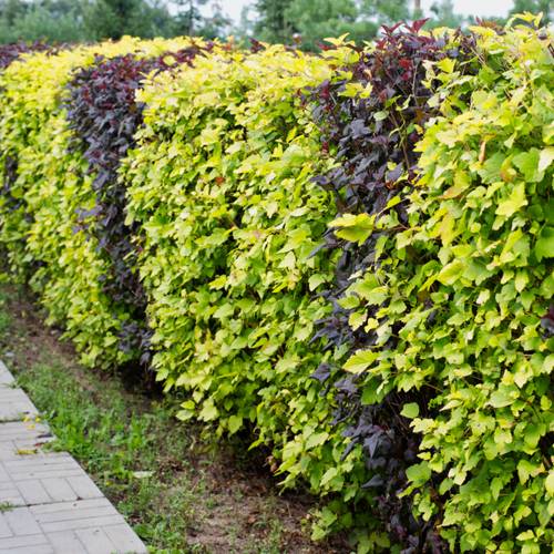 Высаживая в шахматном порядке сорта разных цветов, можно создать необычную двухцветную или трёхцветную изгородь, например: