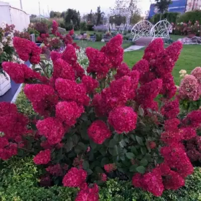 Гортензия метельчатая Самарская лидия, также известная под названиями Samarskya Lydia и Framboisine, заслуженно считается одним из самых желанных растений для современного ландшафтного дизайна. Это среднерослый кустарник с компактной, прямой и очень плотной кроной, которая достигает высоты 130 см при ширине около 110 см. Благодаря крепким красноватым побегам и густой структуре, куст отлично держит форму и не разваливается под тяжестью цветов. Темно-зеленые опушенные листья создают великолепный контрастный фон для ярких соцветий, сохраняя декоративность растения на протяжении всего сезона.