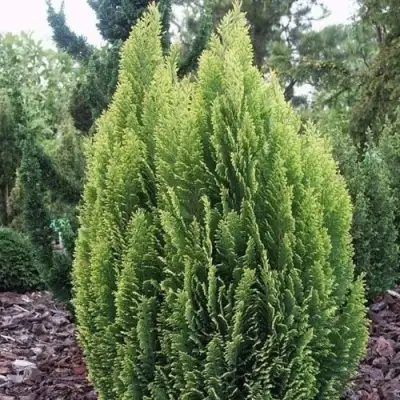 Основной окрас хвои варьируется от нежно-зеленого до голубовато-зеленого, а золотистые и кремовые кончики побегов добавляют особое очарование. Это делает Кипарисовик Элвуди Эмпайр отличным выбором для создания живых изгородей и формирования конусообразных линий в саду.