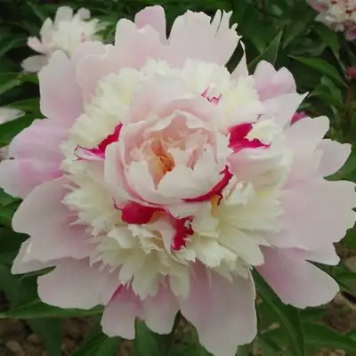 Высота с цветоносом достигает до 80 см, что делает его идеальным для создания небольших цветочных композиций или клумб. Цветки имеют диаметр до 12 см и представлены в трехцветной гамме: бежевый, нежно-розовый и сияющий белый. Мазки розового добавляют особую романтику и роскошь этому пиону.