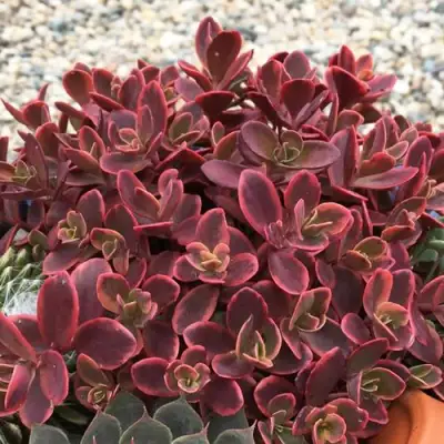 Саженец отличается компактностью, достигая высоты всего 15 см, при этом разрастается в ширину на 40 см. Его стебли имеют прямостоячее направление роста, что способствует образованию плотной зеленой подушки. Листья мелкие, с простой формой и блестящей поверхностью, что создает уникальный визуальный эффект. Базовая окраска листьев розовая, однако вместе с изменением сезонов и температурных условий, их цвет варьируется от богатого бордового и красного до вишнево-красного, а в осенний период становится тыквенно-оранжевым.