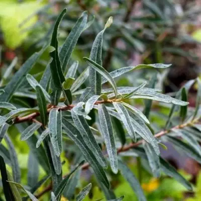 Куст развивается энергично, достигает 2–4 метров, формируя аккуратную округлую или пирамидальную крону. Ветви умеренно колючие либо вовсе лишены шипов, что облегчает уход. Молодые ветви серого цвета, покрыты удлиненной зеленой листвой с серебристым оттенком снизу. Листья узкие, ланцетовидные, осенью приобретают яркие оттенки. Отличительная черта - крупные цветочные почки ( в 2-3 раза больше, чем у женских), напоминающие маленькие шишки, покрытые 5-7 чешуйками. Цветение начинается до распускания листьев: в этот период мужской куст выбрасывает облако пыльцы, которое легко переносится ветром и равномерно опыляет женские экземпляры даже на расстоянии 8–10 метров.