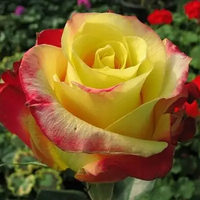 Цветы этой розы имеют привлекательную окраску - ярко-желтый цвет с красно-малиновым кантом. Их форма бокаловидная, что придает им особый шарм. Размер цветка составляет 8-10 см, а количество лепестков - 50. Густомахровая структура цветка делает его еще более привлекательным и эффектным.