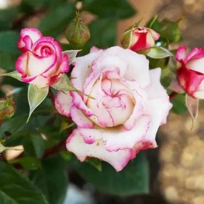 Основная окраска бутона розы Хуба Буба - бело-малиновая, что создает великолепный контраст и привлекательный вид. Кроме того, на цветке присутствуют малиновые размывы, которые придают еще больше очарования и красок.