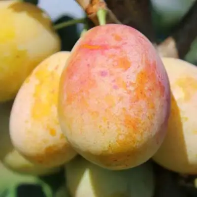 Плоды этого сорта просто невероятные – крупные, весом 50-70 граммов и овальной формы, они поражают своим внешним видом! Кожица фруктов насыщенного желтого цвета с румяной натяжкой на солнечной стороне и густым пруиновым налетом, который легко стирается, создаёт прекрасное визуальное впечатление.