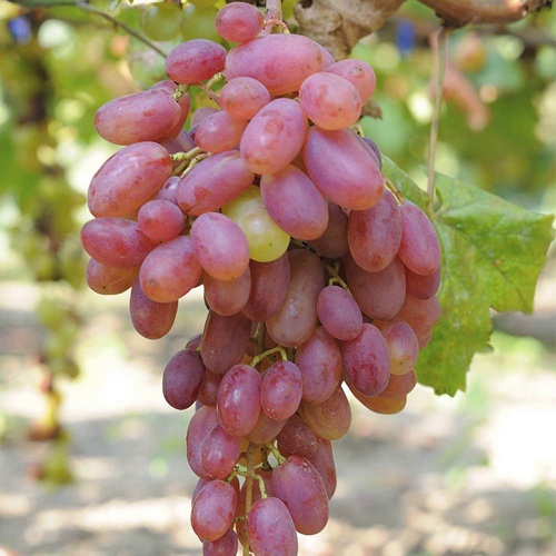 Грозди крупные, конические или широко конические, иногда ветвистые, средней плотности и рыхлые. Средний вес грозди составляет 500–1500 г. Ягоды очень крупные — 11–14 г, отдельные достигают 20 г. Форма плодов удлинённо-овальная или слегка заострённая. Цвет меняется от бело-розового в тени до ярко-розового на солнце. Мякоть плотная, сочная, кожица тонкая, а вкус гармоничный и приятный.